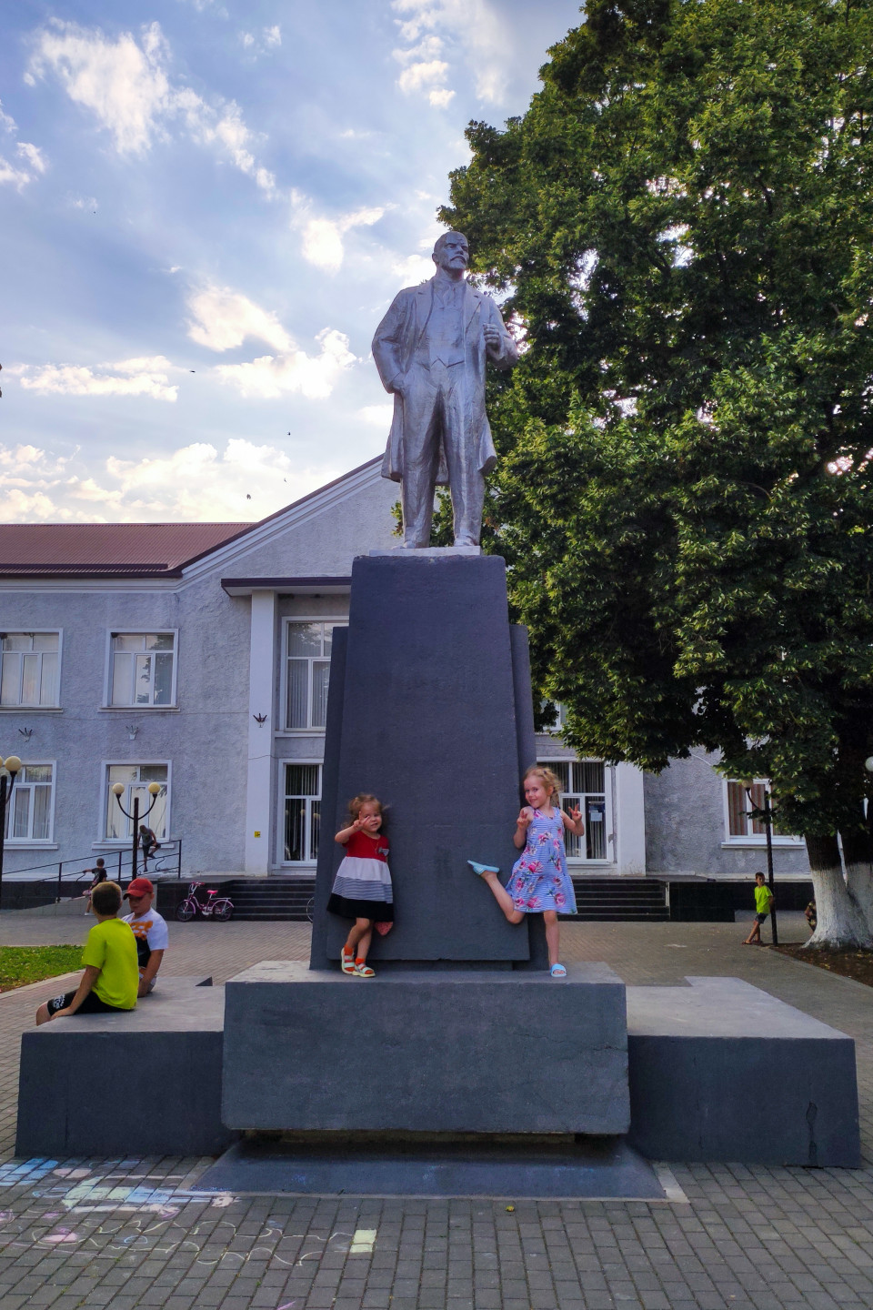 россия город городская среда общественное пространство площадь парк сквер памятник монумент историческое наследие советское наследие история память культура памяти достопримечательность уличная сцена городской пейзаж архитектура общественное здание деревья небо облака лето вечер скульптура постамент советская эпоха монументальная скульптура Владимир Ленин историческая личность дети девочки позирование семейный отдых прогулка тротуарная плитка городской центрПохожие фотографии