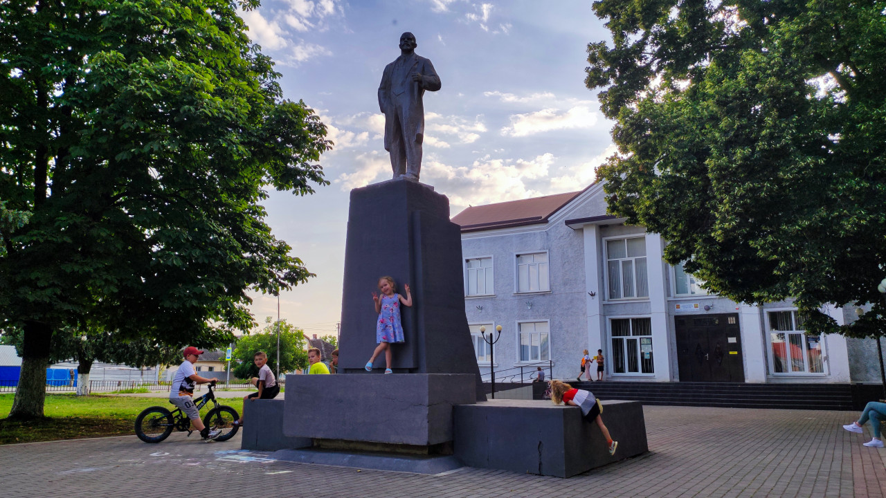 россия город городская среда общественное пространство площадь парк сквер памятник монумент историческое наследие советское наследие история память культура памяти достопримечательность городской пейзаж улица архитектура общественное здание фонари деревья зелень лето вечерний свет облачное небо скульптура постамент советская эпоха монументальная пропаганда Владимир Ленин историческая личность дети игра велосипеды прогулка малый город повседневная жизньПохожие фотографии