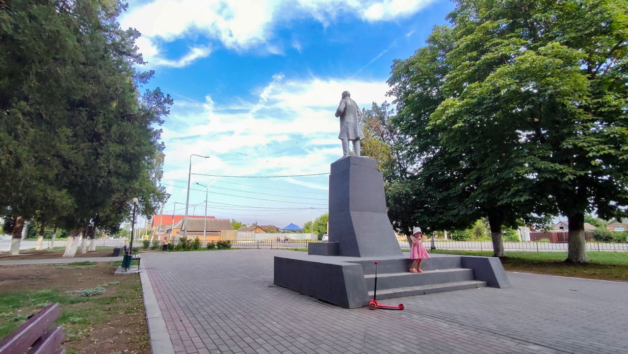 россия город городская среда общественное пространство площадь парк сквер памятник монумент историческое наследие советское наследие история память культура памяти достопримечательность памятник Ленину Ленин В И Ленин Владимир Ильич Ленин советская эпоха скульптура постамент небо облака деревья зелень плитка лавочки фонарь дорога автомобили частные дома провода самокат ребёнок прогулкаПохожие фотографии