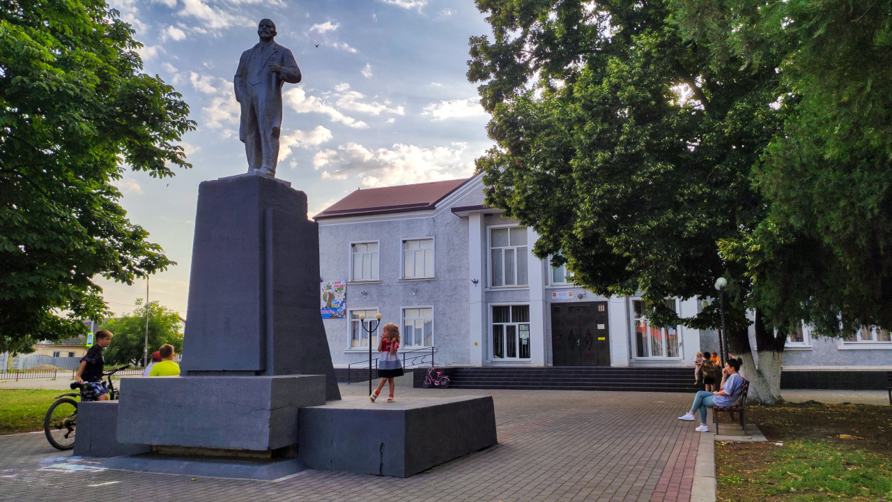 россия город городская среда общественное пространство площадь парк сквер памятник монумент историческое наследие советское наследие история память культура памяти достопримечательность уличная жизнь архитектура общественное здание входная группа лавочки фонари деревья зелень лето вечерний свет облачное небо скульптура постамент советская эпоха Владимир Ленин историческая личность дети игра велосипед прогулка благоустройство малый городПохожие фотографии