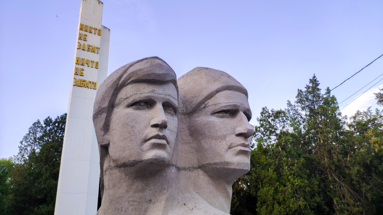 Крупный план сделан у мемориала в Прохладном (Кабардино-Балкарская Республика, Россия): два каменных лица солдат обращены в разные стороны, черты подчеркнуты строгими плоскостями и зернистой фактурой материала. Слева в кадре поднимается белая стела с золотыми буквами «Никто не забыт, ничто не забыто», на фоне голубое вечернее небо. Справа видны кроны деревьев и линии проводов, что подчёркивает расположение памятника в городской парковой среде. Съёмка снизу усиливает монументальность образов. Фото подходит для материалов о памятниках войны, монументальной скульптуре и сохранении исторической памяти.