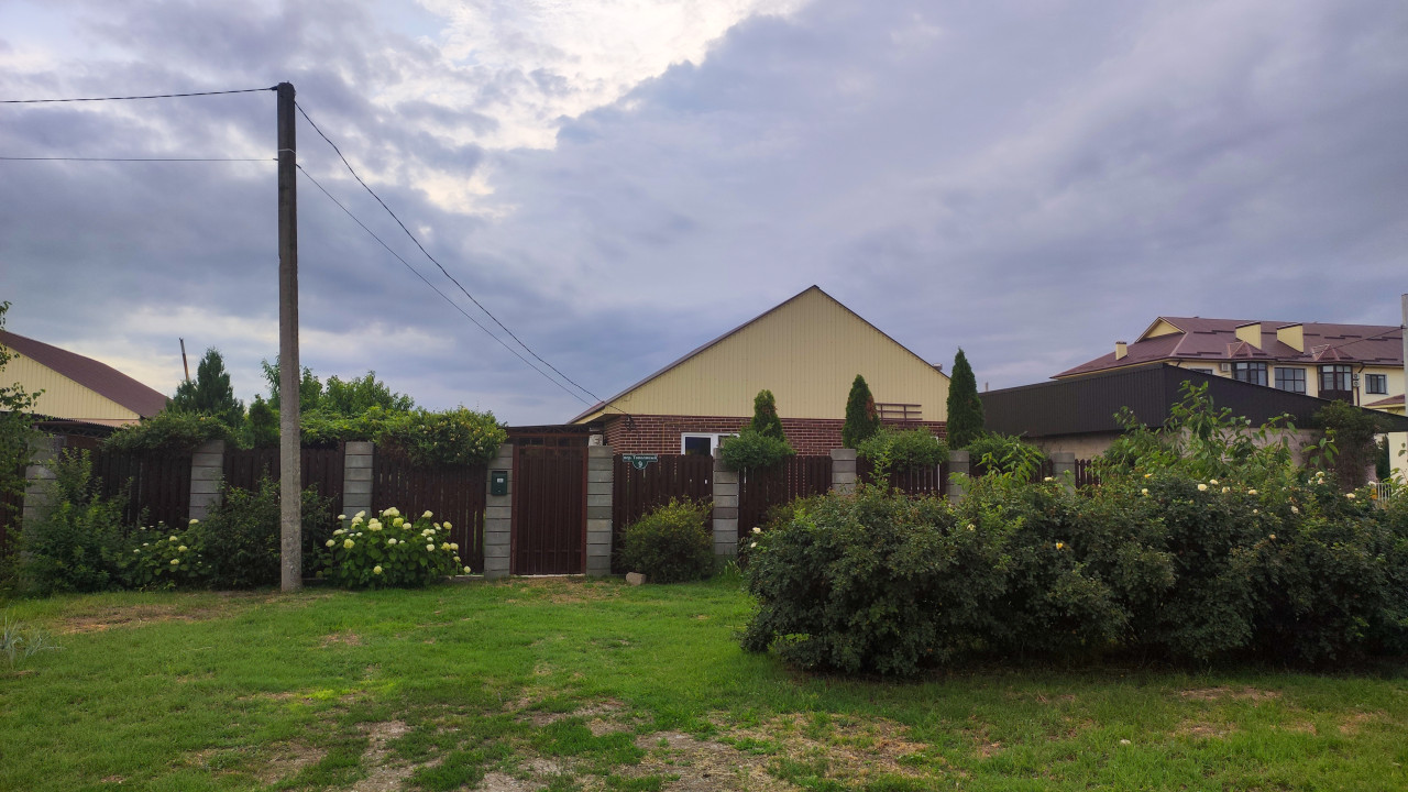 Вид на ограждённый участок в частном секторе: тёмный забор с калиткой и кирпичными столбами, за ним одноэтажное строение с двускатной крышей. Перед забором зелёный газон и густые кусты, заметны цветущие растения у ограды и декоративные хвойные посадки. Слева стоит бетонный столб, к нему подключены провода, которые уходят в сторону по кадру. Небо облачное с просветами, дневное освещение мягкое. Фото подходит для тем о благоустройстве, ландшафтном дизайне, загородной недвижимости и инфраструктуре улиц.