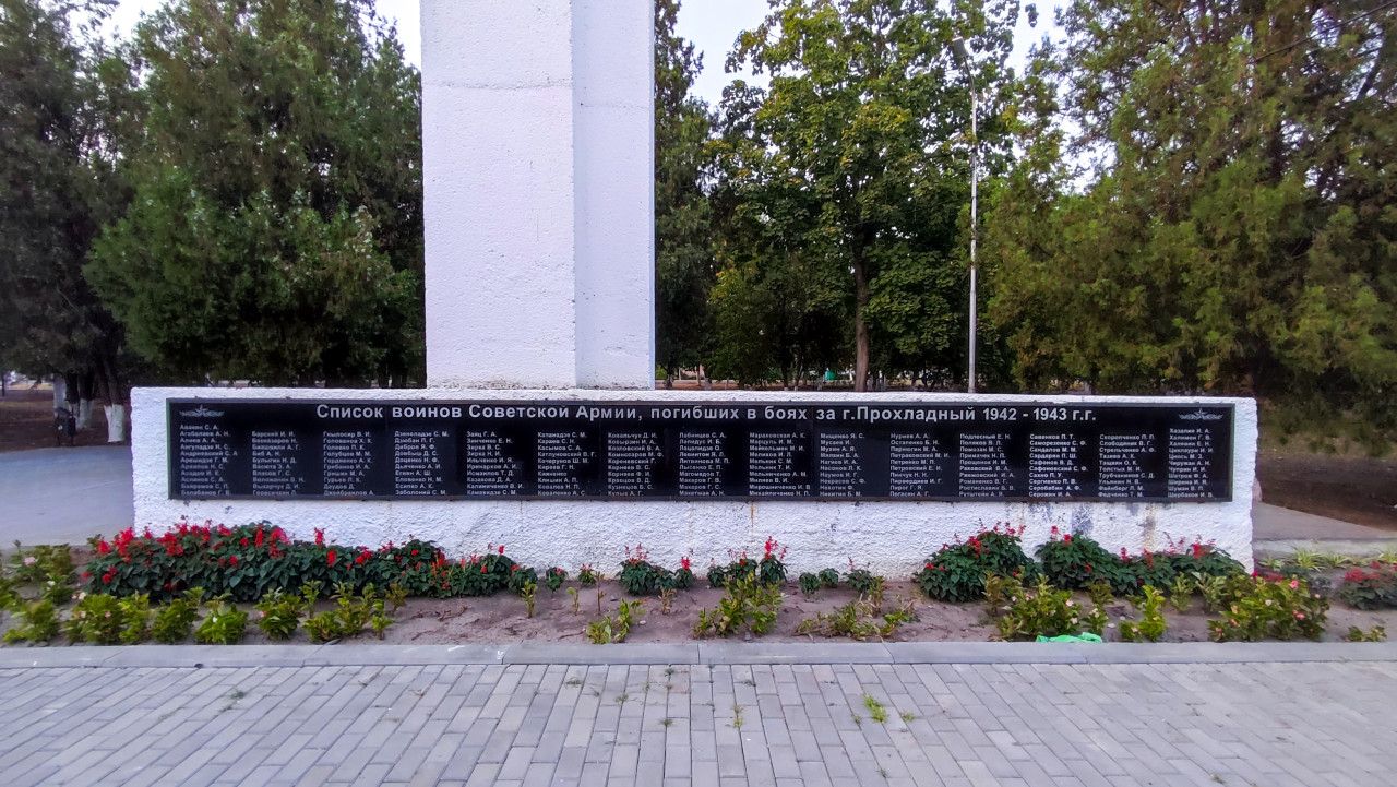 россия город городская среда общественное пространство площадь парк сквер памятник монумент историческое наследие советское наследие история память культура памяти достопримечательность Россия Кабардино Балкария Прохладный мемориал памятная плита мемориальная табличка список погибших фамилии Советская Армия 1942 1943 Великая Отечественная война Вторая мировая война стела гранит чёрный камень клумба красные цветы благоустройство памятные даты День Победы увековечениеПохожие фотографии