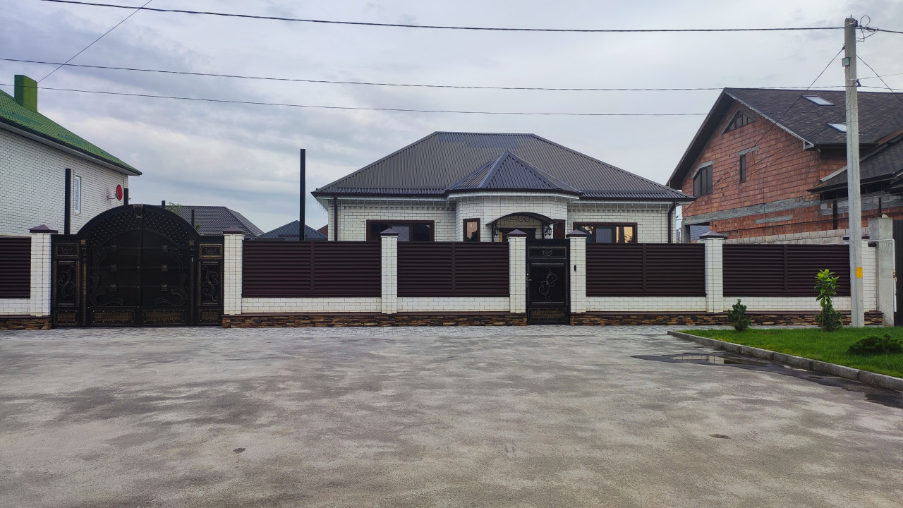 архитектура частный сектор жилой дом недвижимость фасад территория забор ограждение ворота калитка улица коттедж кирпичные столбы металлический забор кованые ворота декоративный металл фасад дома крыша двор асфальт бордюр газон соседний дом стройка строительный объект провода опора облачное небо пригород безопасностьПохожие фотографии