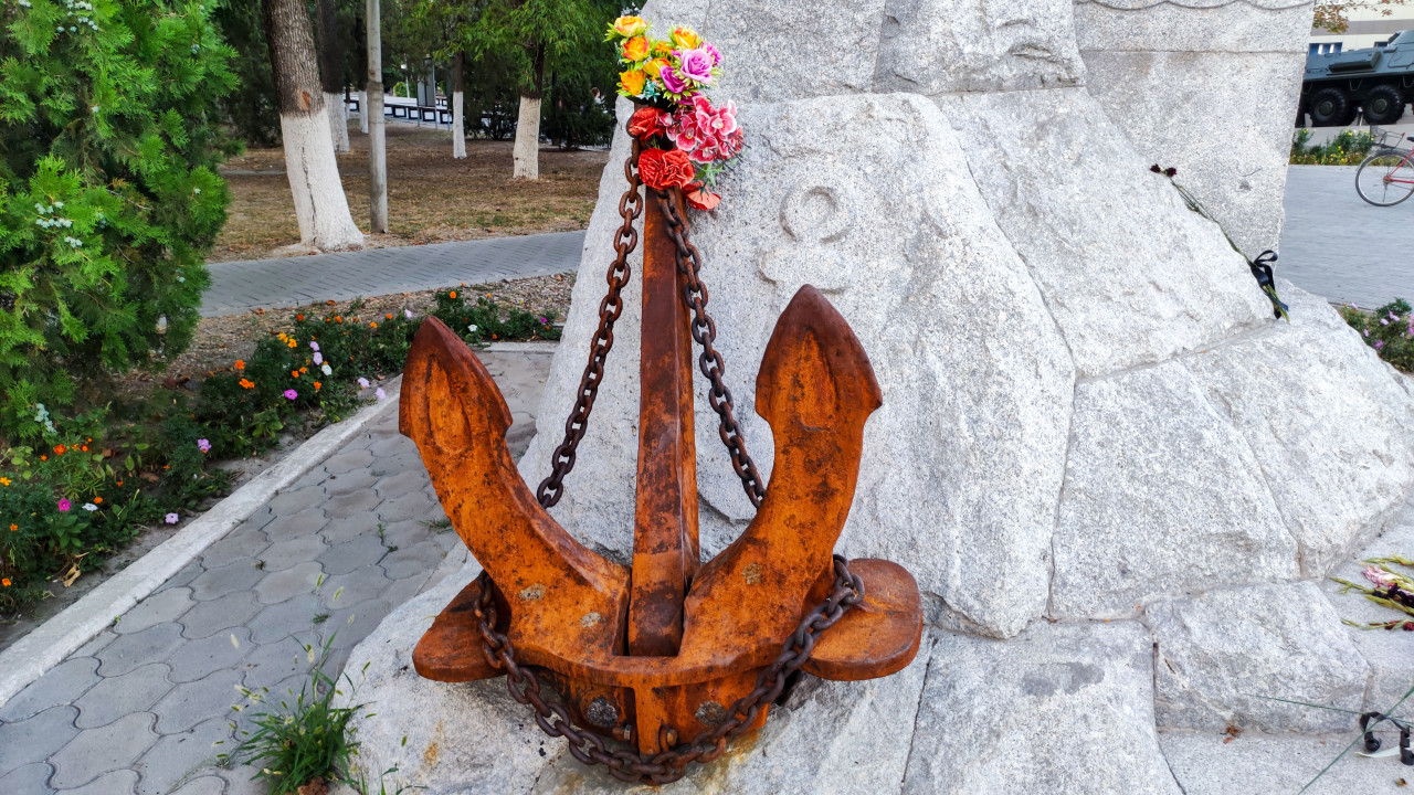 россия город городская среда общественное пространство площадь парк сквер памятник монумент историческое наследие советское наследие история память культура памяти достопримечательность Россия Кабардино Балкария Кабардино Балкарская Республика Прохладный Сквер Памяти якорь цепь морская символика ВМФ военно морская история мемориал деталь памятника крупный план металл ржавчина фактура текстура цветы букет постамент плитка благоустройство клумбаПохожие фотографии