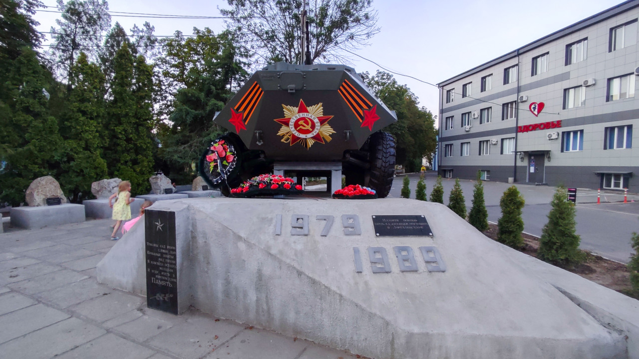россия город городская среда общественное пространство площадь парк сквер памятник монумент историческое наследие советское наследие история память культура памяти достопримечательность Россия Кабардино Балкария Кабардино Балкарская Республика Прохладный Сквер Памяти мемориал Афганская война 1979 1989 воины интернационалисты 9 мая 1997 бронетранспортёр военная техника постамент памятные плиты фамилии героев цветы венок гвоздики табличка туи благоустройство патриотическая тема памятное местоПохожие фотографии
