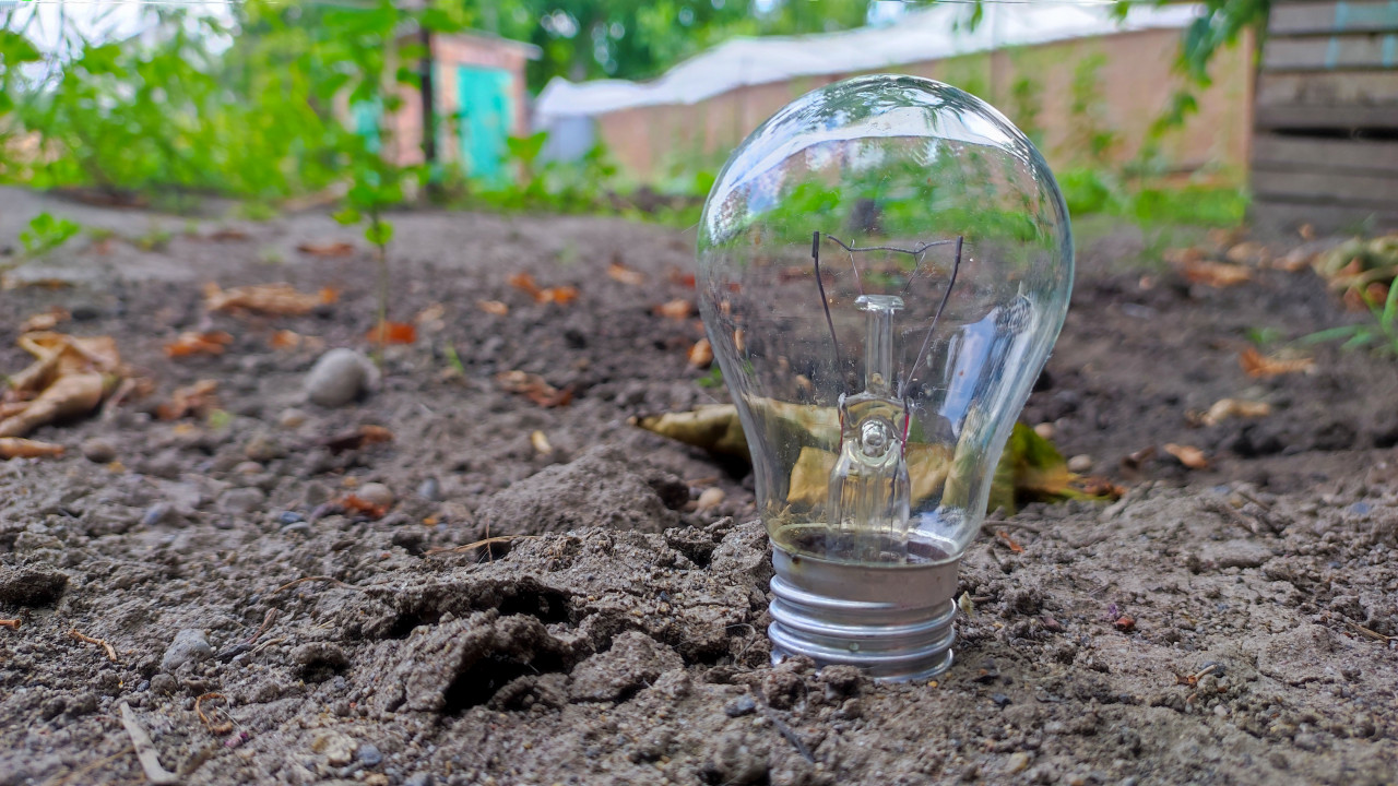 На фотографии крупным планом стеклянная лампа накаливания с металлическим цоколем стоит на сухой рыхлой земле в огороде. Внутри колбы видны нить и держатели, на стекле отражаются деревья и небо. Фон размыт: заметны грядки, молодые всходы, опавшие листья, зелёная калитка и хозяйственные постройки, что указывает на участок частного дома. Съёмка выполнена на уровне земли при дневном освещении. Фото можно использовать для иллюстраций об электричестве, энергосбережении, утилизации и предметах быта современного быта.