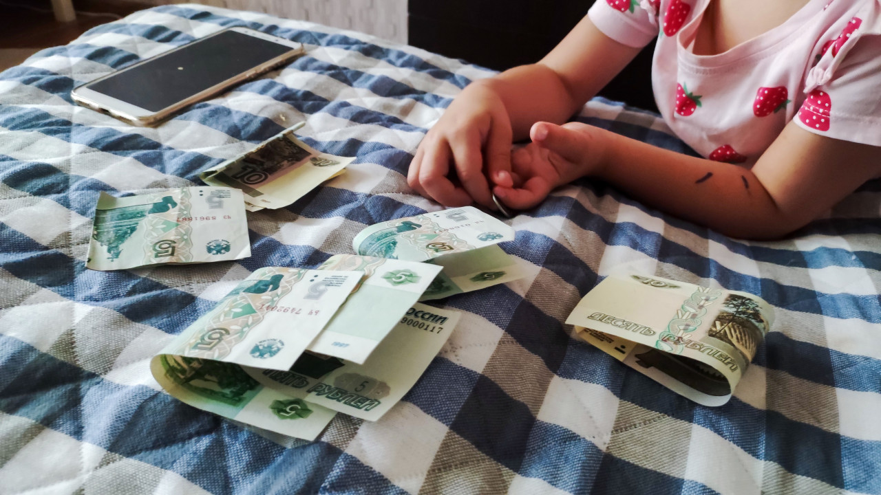 Ребёнок считает рублёвые купюры на клетчатой скатерти