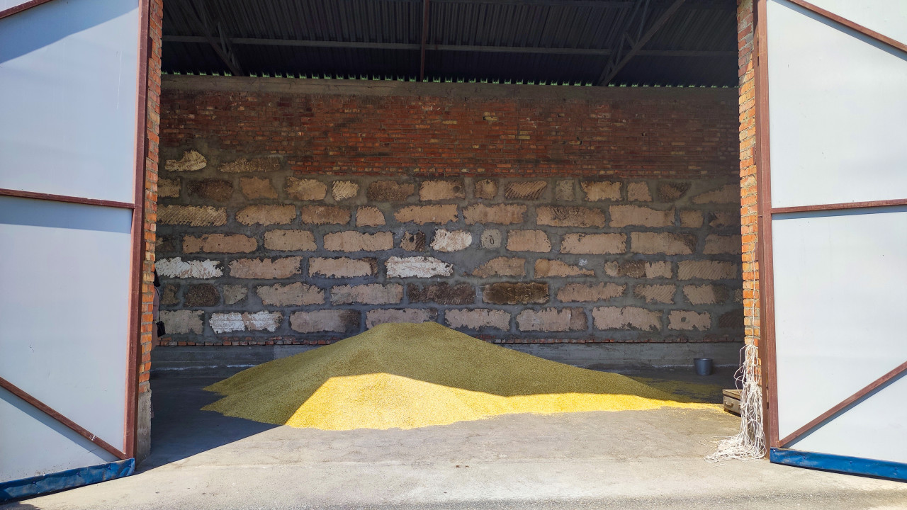 Куча зерна на бетонном полу внутри открытого склада с воротами