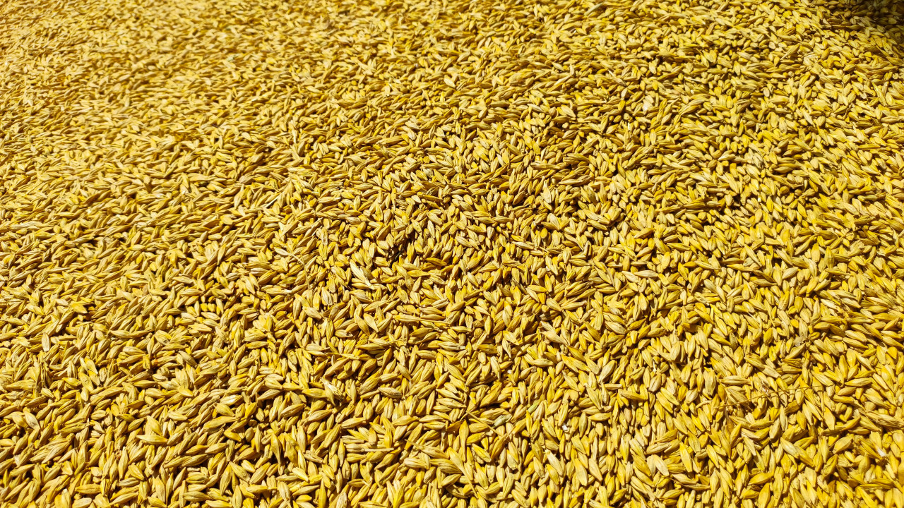 На фото крупным планом показана насыпь зерна: зёрна вытянутой формы лежат плотным слоем, создавая однородную золотистую поверхность. Освещение яркое и равномерное, хорошо читаются оболочки и мелкие детали, что делает кадр наглядным для темы качества и состояния зерновых культур. Такой материал используют для иллюстраций о хранении и переработке урожая, производстве кормов, пивоваренном и пищевом сырье. Фотография подойдёт для аграрных статей, презентаций фермерских хозяйств, маркетплейсов сырья, полиграфии и инфографики о зерновом рынке.
