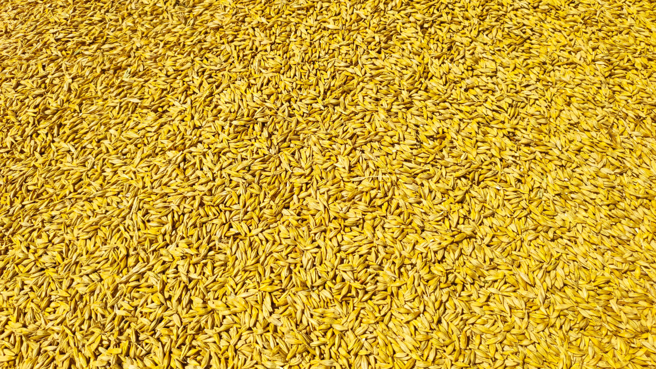 Фотография снята сверху и показывает ровный слой зерна, заполняющий весь кадр без посторонних предметов. Зёрна одинакового размера и формы создают плотный узор, хорошо читаются линии оболочки и естественные цветовые переходы от светло-жёлтого до золотистого. Такой «чистый» фон удобен для дизайна и иллюстраций, когда нужен визуальный образ сельхозсырья и урожая. Снимок подходит для материалов о зерновых культурах, хранении и переработке, производстве кормов, аграрной статистике, а также для подложек в презентациях, упаковке и рекламе фермерской продукции.