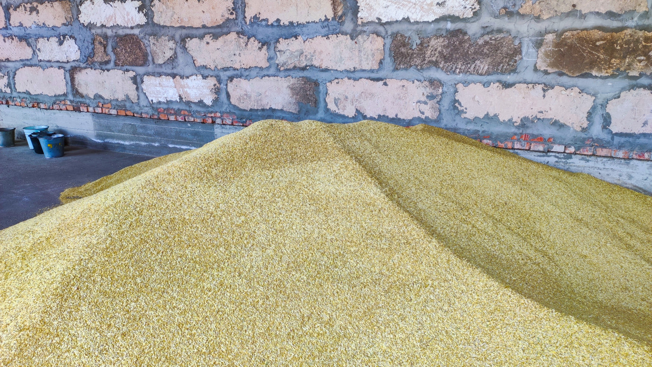 Куча дроблёного зерна в складском помещении у кирпичной стены