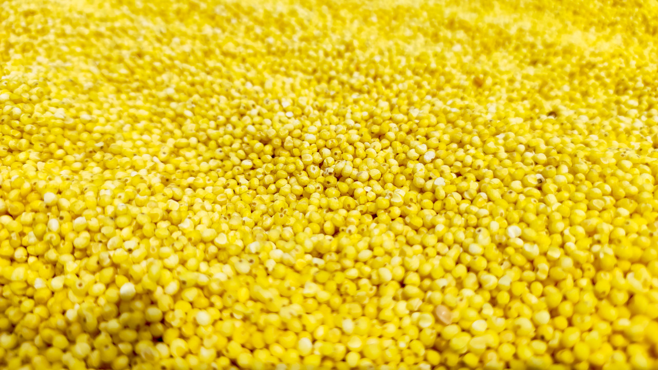 сельское хозяйство еда продукты зерно злаки урожай аграрная продукция сырьё натуральный продукт хранение производство переработка текстура крупа пшено просо злак сыпучие продукты сухой продукт ингредиенты кулинария каша питание здоровое питание желтый цвет фон крупный план макросъёмка перспектива размытый фон россыпь пищевые запасыПохожие фотографии