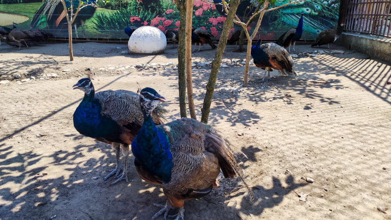 природа животные животный мир фауна зоология биология охрана животных среда обитания содержание животных уход за животными зоопарк нальчик птицы павлины павлин декоративные птицы экзотические птицы оперение синяя шея вольер ограждение контактный зоопарк миниферма стая птиц песок грунт тени солнечный свет лето деревья панно рисунок на стене городской парк семейный отдых экскурсия наблюдение содержание птиц птицеводствоПохожие фотографии