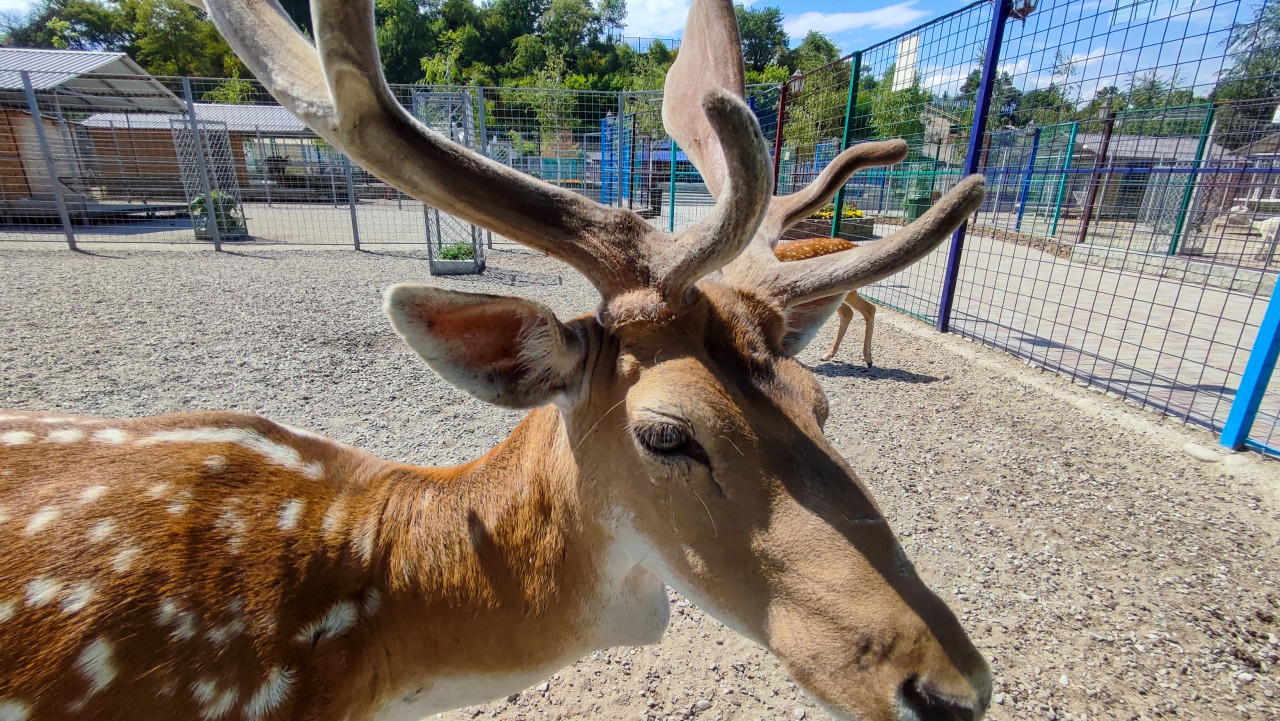 природа животные животный мир фауна зоология биология охрана животных среда обитания содержание животных уход за животными зоопарк нальчик дикие животные олень пятнистый олень рога панты самец пятнистая шкура вольер загон сетчатый забор ограждение гравий площадка контактный зоопарк зооферма поведение животных солнечный день голубое небо деревья инфраструктура прогулка туризм семейный отдыхПохожие фотографии