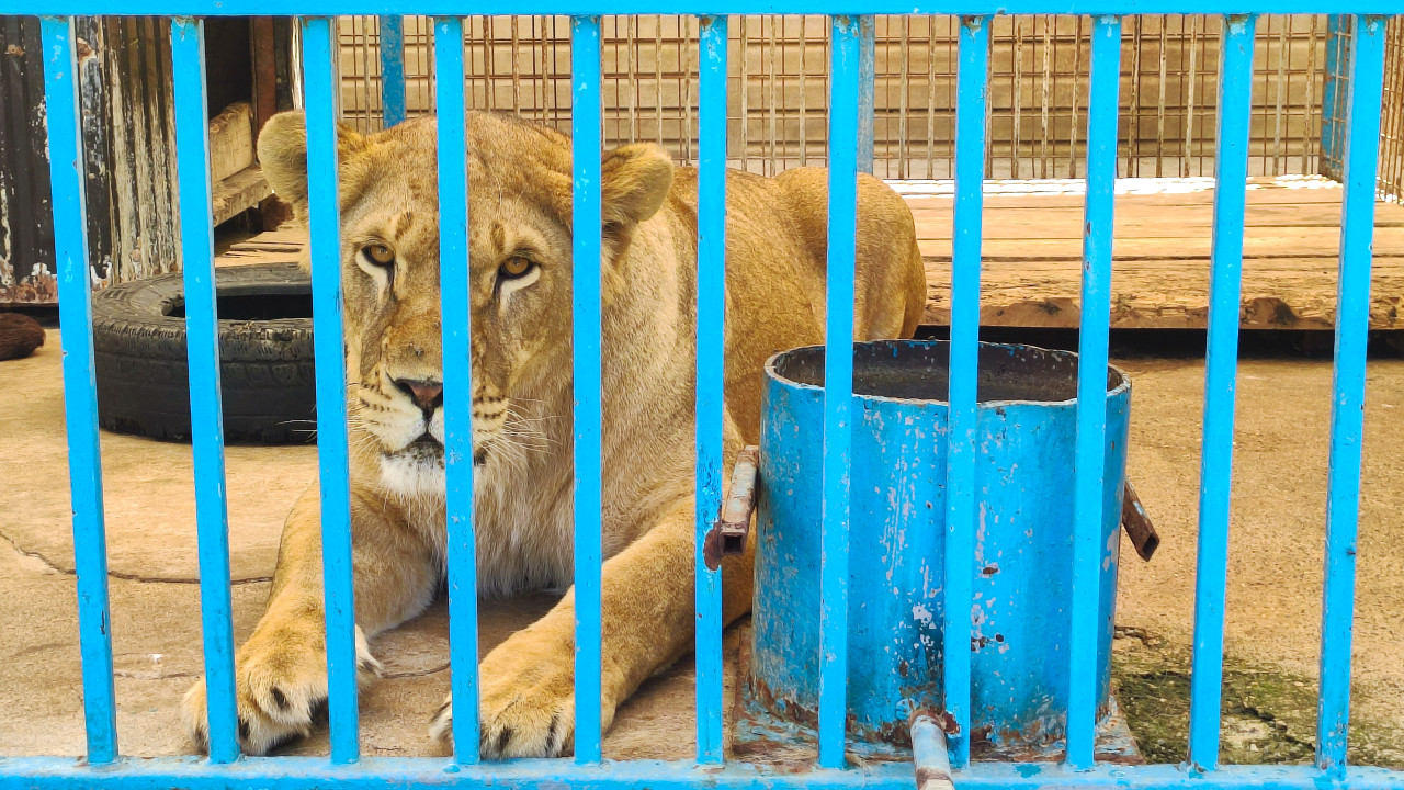 природа животные животный мир фауна зоология биология охрана животных среда обитания содержание животных уход за животными зоопарк нальчик дикие животные хищник кошачьи лев львица вольер клетка решётка синие прутья крупный план портрет животного взгляд бетонный пол поилка кормушка ржавчина потертости шина обогащение среды условия содержания ветеринария безопасность экскурсия наблюдение туризмПохожие фотографии