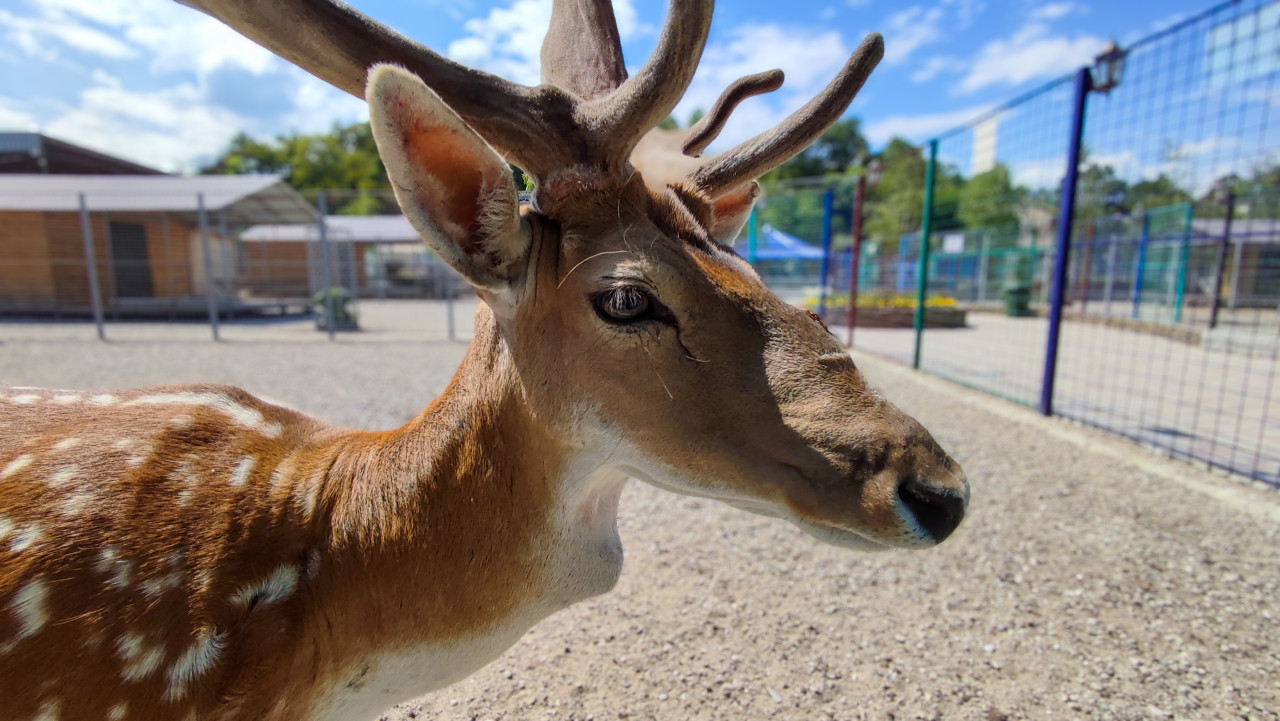 природа животные животный мир фауна зоология биология охрана животных среда обитания содержание животных уход за животными зоопарк нальчик дикие животные олень пятнистый олень рога панты профиль портрет животного крупный план пятна на шерсти глаз морда ухо вольер загон контактный зоопарк сетчатый забор гравий солнечный день голубое небо облака поведение животных оленеводство инфраструктура туризм экотуризмПохожие фотографии