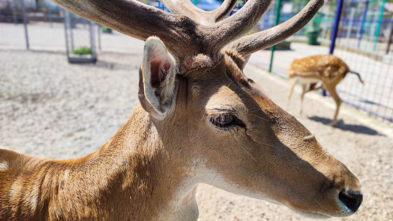 Крупный портрет оленя с разветвлёнными рогами, покрытыми бархатистой «пантовой» кожей: в кадре голова и шея, видны ресницы, ухо с розоватой внутренней поверхностью и мягкая текстура шерсти. Животное снято на открытой гравийной площадке, на заднем плане размыто виден ещё один пятнистый олень и секции сетчатого ограждения. Солнечный свет создаёт контрастные тени на морде и подчёркивает рельеф рогов. Фото подходит для тем о зоопарках, оленеводстве, биологии рогов и наблюдении за животными в неволе.