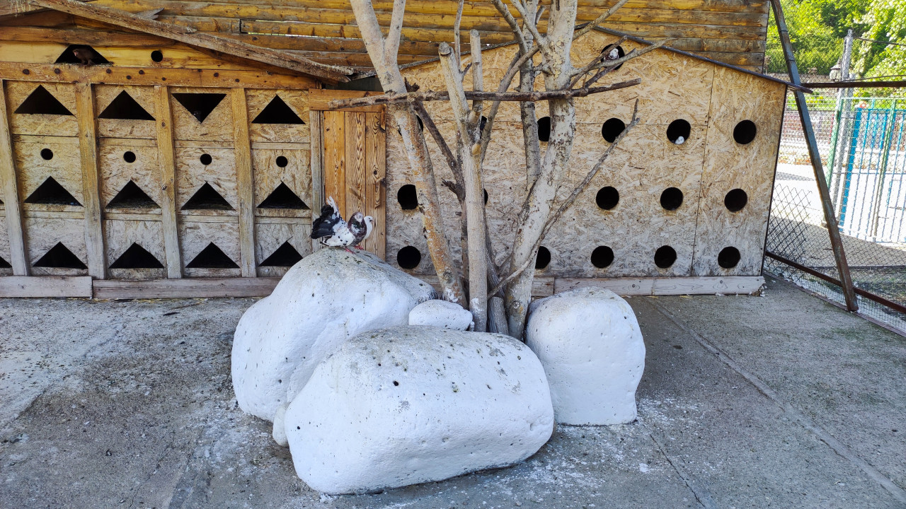 природа животные животный мир фауна зоология биология охрана животных среда обитания содержание животных уход за животными зоопарк нальчик птицы голубь голубятня птичник вольер ограждение домашние птицы декоративные голуби птицеводство гнёзда летки треугольные отверстия круглые отверстия деревянная конструкция стенд из дерева белые камни валуны ветки насест песок следы птиц дневной свет лето ферма сельский двор уход за птицами хозяйствоПохожие фотографии