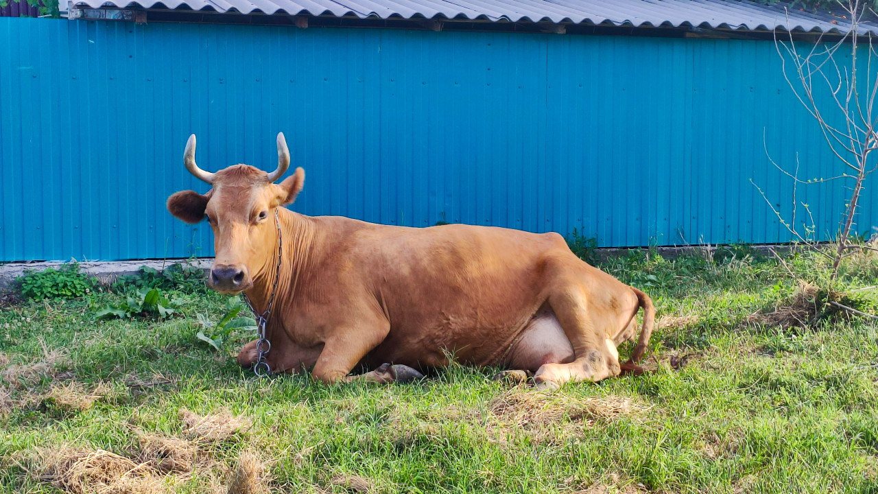 животные домашние животные сельское хозяйство ферма животноводство крупный рогатый скот корова рога привязь цепь пастбище трава деревня забор портрет животного рыжая масть морда уши сено сельская жизнь подворье профлист металлический забор лето дневной свет спокойное животное уход за животнымиПохожие фотографии