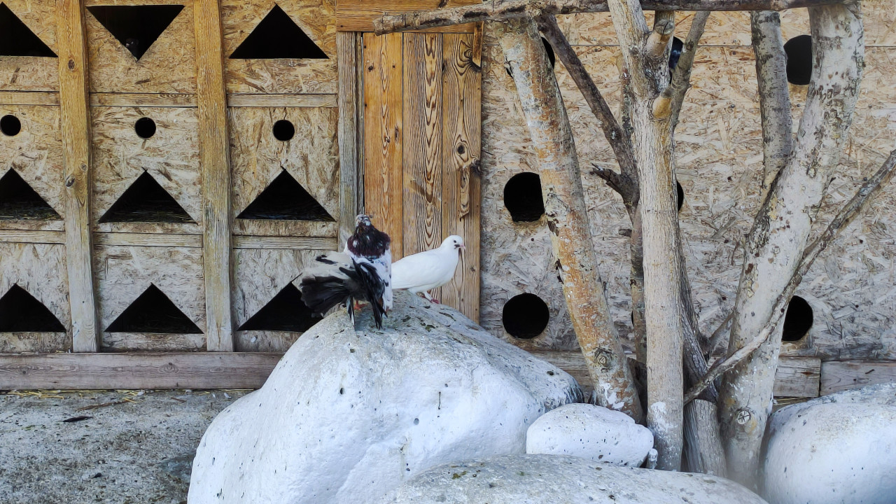 природа животные животный мир фауна зоология биология охрана животных среда обитания содержание животных уход за животными зоопарк нальчик птицы голуби голубь белый голубь пёстрый голубь пара птиц оперение перья хвост насест ветки белый камень валун голубятня птичий домик вольер птичий вольер гнёзда летки деревянная стена дверь песчаный пол дневной свет лето ферма мини зоопарк уход за птицами содержание птицПохожие фотографии