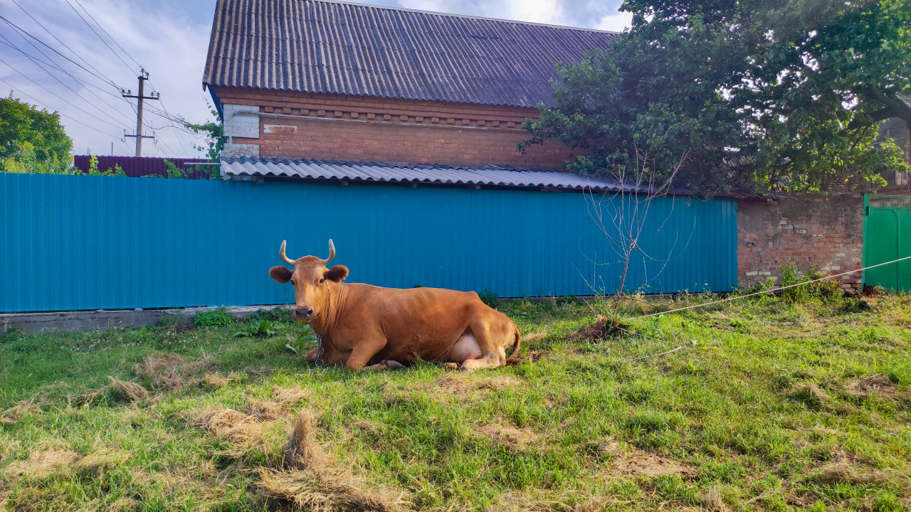 животные домашние животные сельское хозяйство ферма животноводство крупный рогатый скот корова рога привязь цепь пастбище трава деревня забор рыжая корова сельский двор подворье частный сектор профнастил кирпичное здание хозяйственная постройка шиферная крыша электропровода лето дневной свет сельский пейзаж спокойствиеПохожие фотографии