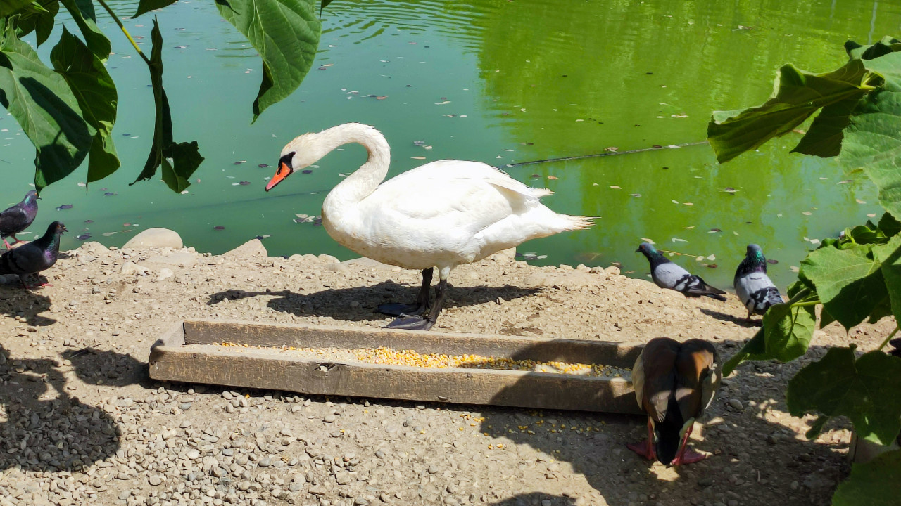 природа животные животный мир фауна зоология биология охрана животных среда обитания содержание животных уход за животными зоопарк нальчик птицы лебедь белый лебедь водоплавающие птицы крупный план оперение шея лебедя клюв голуби городские птицы пруд водоём берег гравий песок бетонный бортик зелёная вода отражения листва тень лето солнечный день парк наблюдение за птицами экология туризм отдыхПохожие фотографии