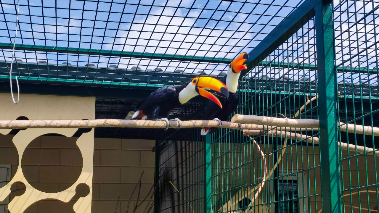 Два тукана на жерди смотрят вверх под сеткой вольера