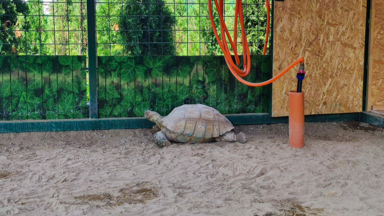 природа животные животный мир фауна зоология биология охрана животных среда обитания содержание животных уход за животными зоопарк нальчик рептилии черепаха сухопутная черепаха крупная черепаха панцирь щитки панциря лапы террариум вольер загон песок песчаный грунт сафари парк поилка вода шланг оборудование ограждение сетка зелёные панели лето июль дневной свет экопросвещение наблюдениеПохожие фотографии