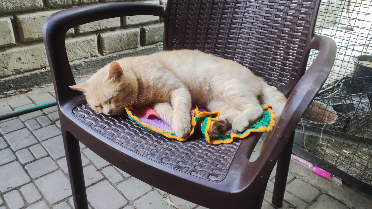 животные домашние животные кошка кот питомец рыжий кот сон отдых расслабление веранду двор частный дом тротуарная плитка пластиковое кресло садовая мебель вязаная подстилка текстиль уют лето дневной свет спокойствие шерсть лапы хвост без людей повседневная жизнь зоология уход за животнымиПохожие фотографии