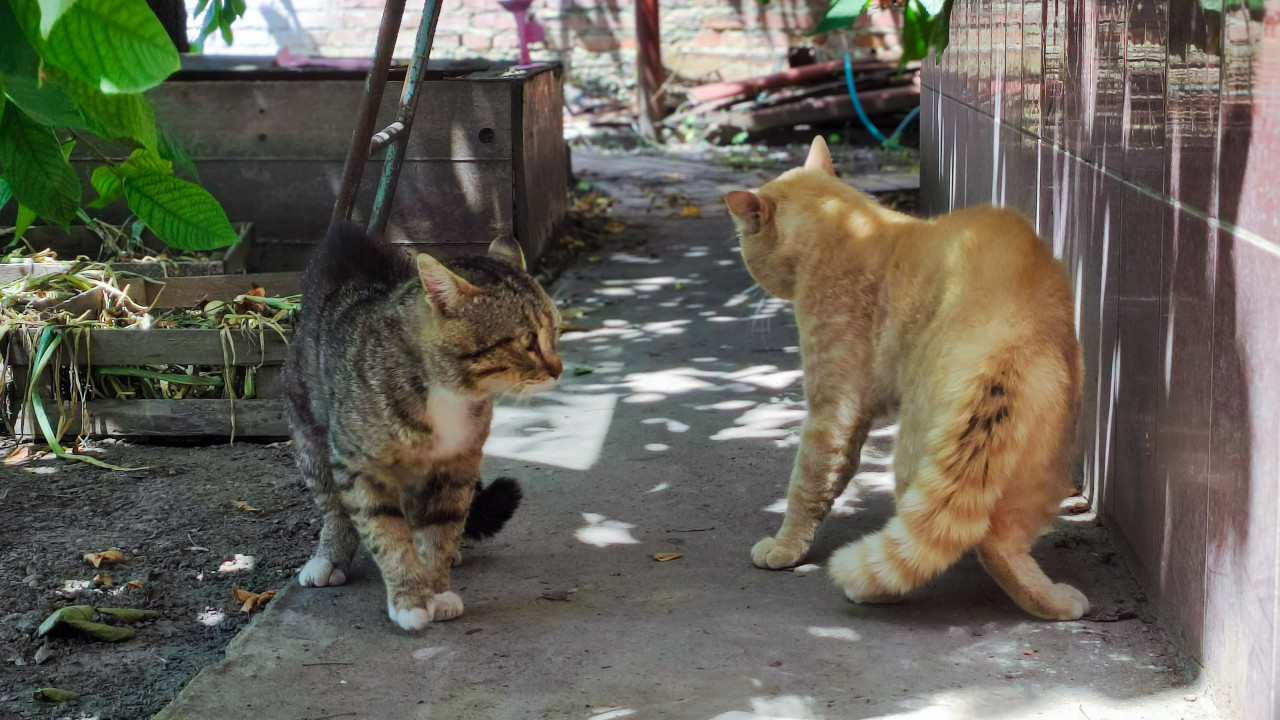 Дворовая сцена с двумя кошками: полосатая кошка с белой грудью стоит у края дорожки, а рыжий кот возле облицованной плиткой стены повернул голову в сторону и прислушивается. На бетоне заметны пятна света и тени от веток, рядом лежат сухие листья. На заднем плане видны деревянные ящики, садовые предметы и кирпичная стена. Фотография подходит для материалов о домашних питомцах, кошачьей коммуникации, уличной жизни и повседневности частного двора.