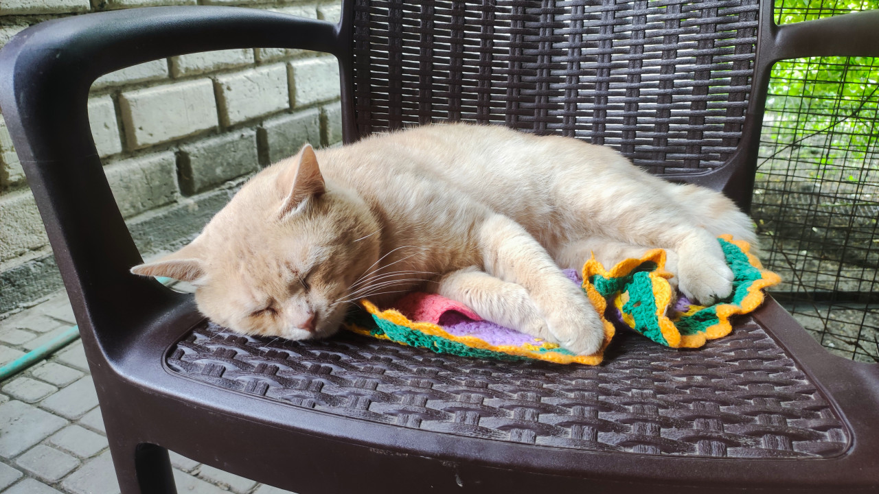 животные домашние животные кошка кот питомец рыжая кошка сон дремота крупный план морда кота лапы усы шерсть уют спокойствие вязаный коврик ручная работа пряжа текстура садовая мебель пластиковое кресло веранда двор кирпичная стена сетка дневной свет отдых дома уход за питомцем фото для блогаПохожие фотографии