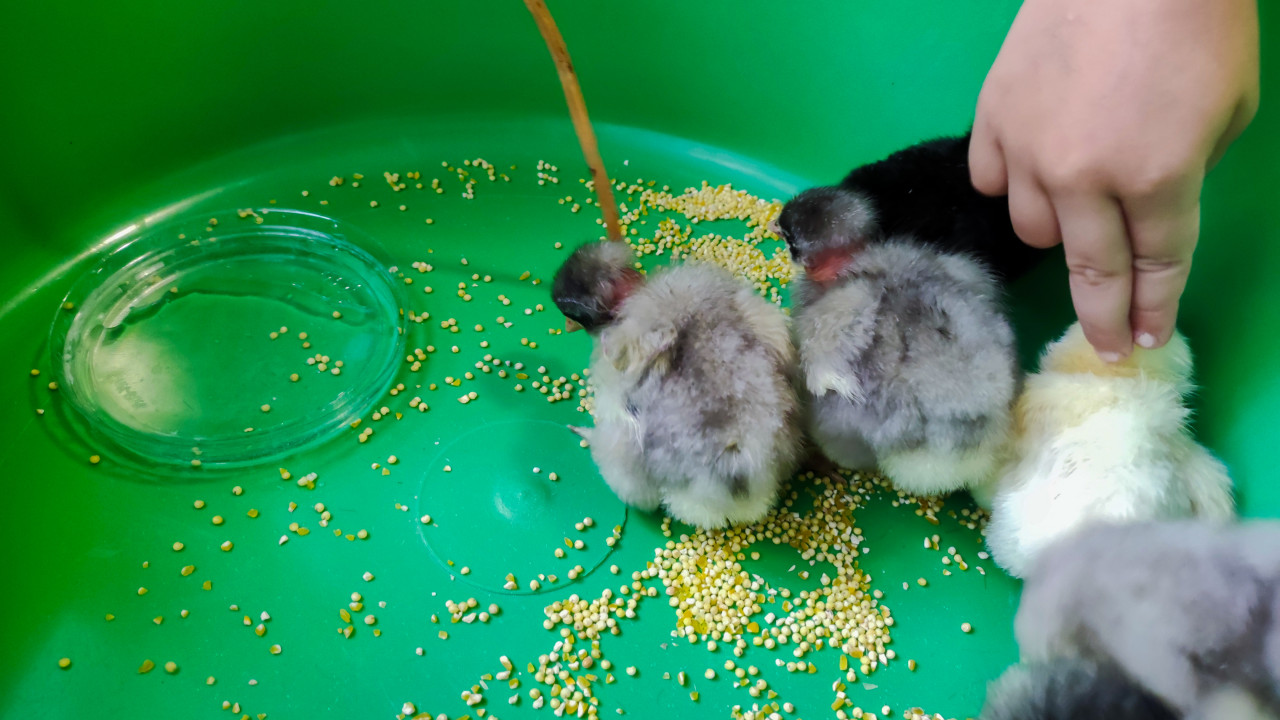 животные птицы домашние животные домашняя птица птицеводство уход за птицей содержание птицы разведение птицы домашнее хозяйство куры цыплята птенцы молодняк ферма сельское хозяйство кормление корм пшено зерно поилка вода пластиковый таз зелёный контейнер уход за животными содержание птиц детская рука контактный зоопарк мини ферма обучение безопасность пушистые цыплята белый цыплёнок серый цыплёнок чёрный цыплёнокПохожие фотографии