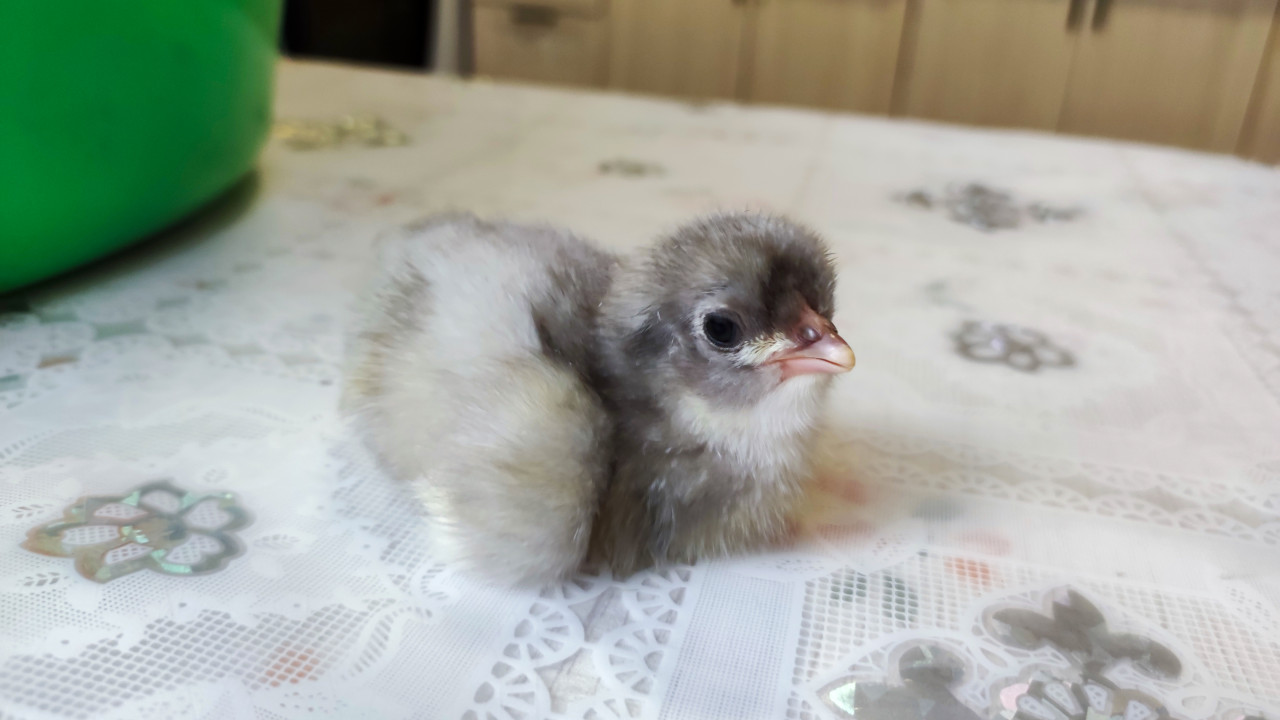 животные птицы домашние животные домашняя птица птицеводство уход за птицей содержание птицы разведение птицы домашнее хозяйство цыплёнок серый цыплёнок птенец молодняк суточные цыплята фермерство сельское хозяйство подворье выращивание уход домашние условия в помещении стол скатерть кружевной узор интерьер кухни зелёный контейнер брудер крупный план портрет птенца пух клюв лапки мягкий светПохожие фотографии