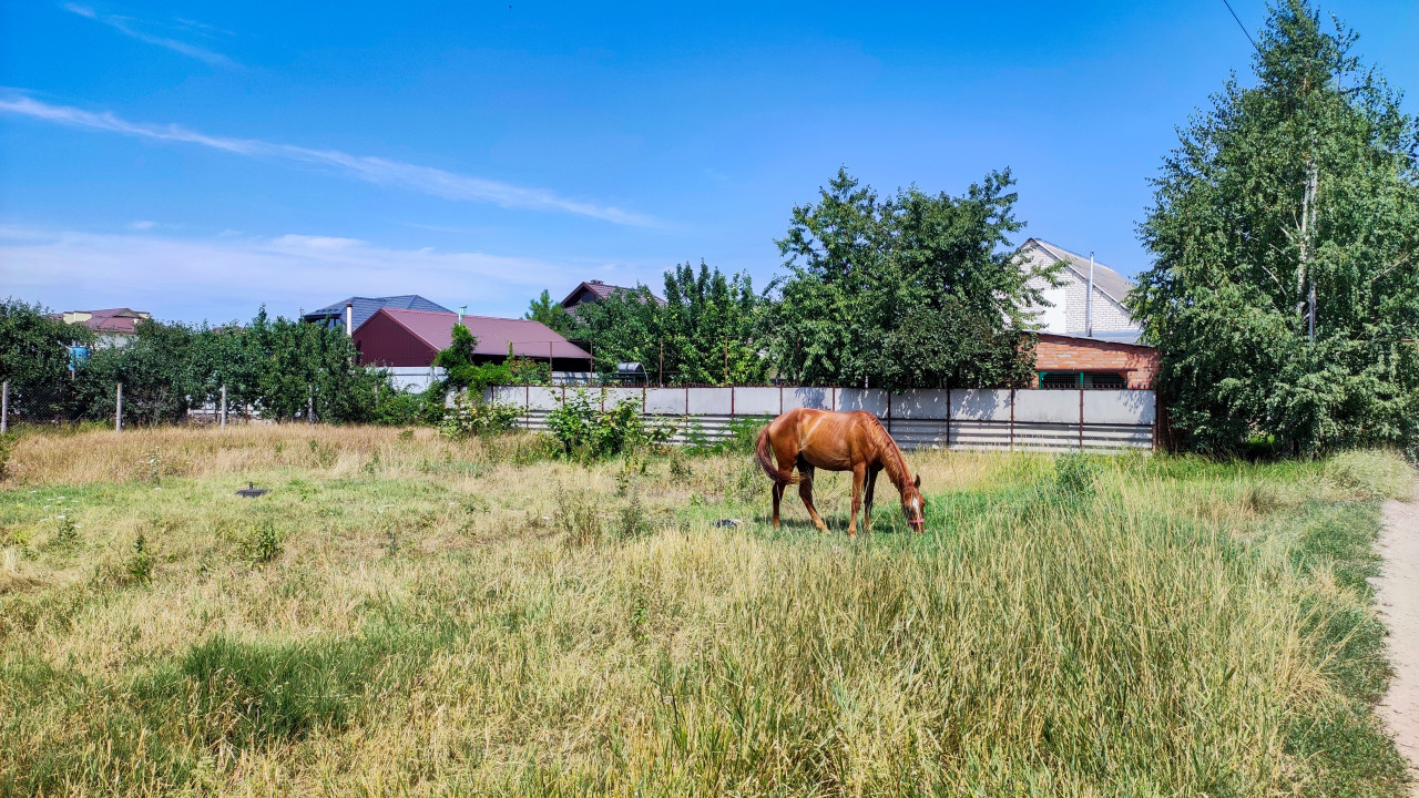 животные домашние животные млекопитающие лошадь конь пастбище выпас трава поле сельская местность деревня частный сектор забор коневодство сельское хозяйство рыжая лошадь луг частные дома крыши домов деревья кустарник природа лето солнечный день голубое небо облака загородная жизнь фермерство спокойствие ландшафт грунтовая дорогаПохожие фотографии