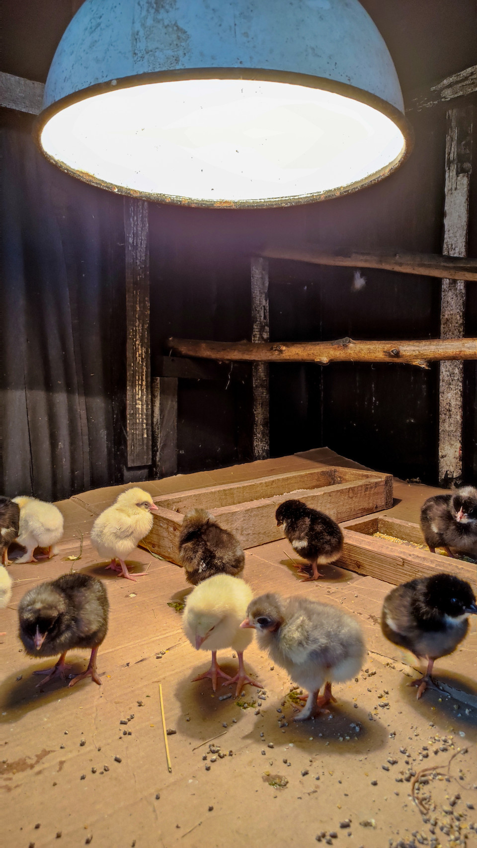 Вертикальный кадр показывает брудерную зону в птичнике: сверху доминирует крупный металлический плафон яркой лампы обогрева, под ним на картонном настиле стоят цыплята белого, чёрного и серого окраса. На полу заметны крошки корма, крупинки и соломинки, на заднем плане деревянные корытца и бортики, тёмные доски стен и жердь. Свет жёлто-тёплый, создаёт ощущение защищённого тёплого места для молодняка. Фото подходит для иллюстраций о выращивании цыплят, оборудовании брудера, обогреве и организации ухода в домашнем птицеводстве.