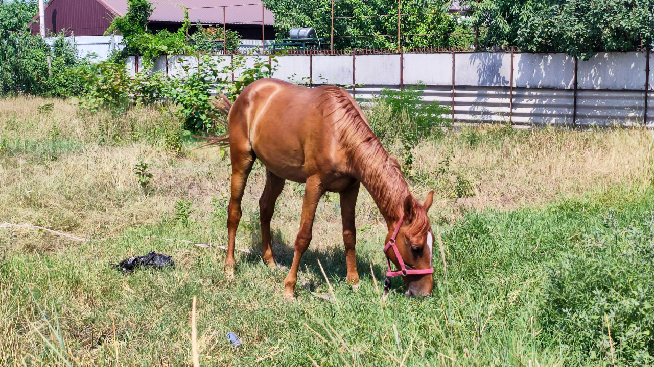 На снимке рыжая лошадь с белой отметиной на морде пасётся на участке с высокой травой и сорной растительностью. На голове розовый недоуздок, грива лежит вдоль шеи, хвост приподнят. На заднем плане — сплошной металлический забор и деревья, за ограждением видны крыши частных домов и хозяйственные постройки. Освещение яркое, летний дневной свет, тени мягкие. Фотография подходит для материалов о сельской жизни, содержании лошадей, фермерских хозяйствах и пастбищах.