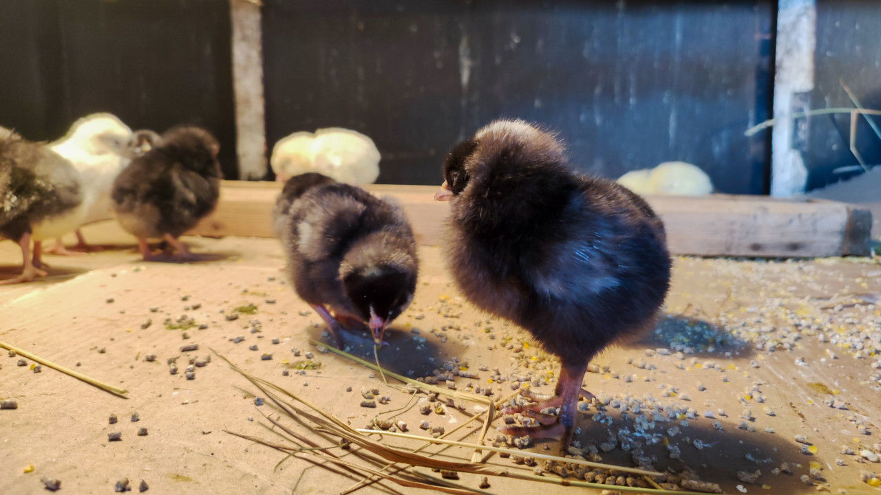 животные птицы домашние животные домашняя птица птицеводство уход за птицей содержание птицы разведение птицы домашнее хозяйство цыплята птенцы молодняк чёрный цыплёнок птенец кормление корм комбикорм гранулы корма рассыпанный корм клюёт корм деревянный пол настил солома сено птичник курятник брудер ферма мини ферма сельское хозяйство деревенский бытПохожие фотографии