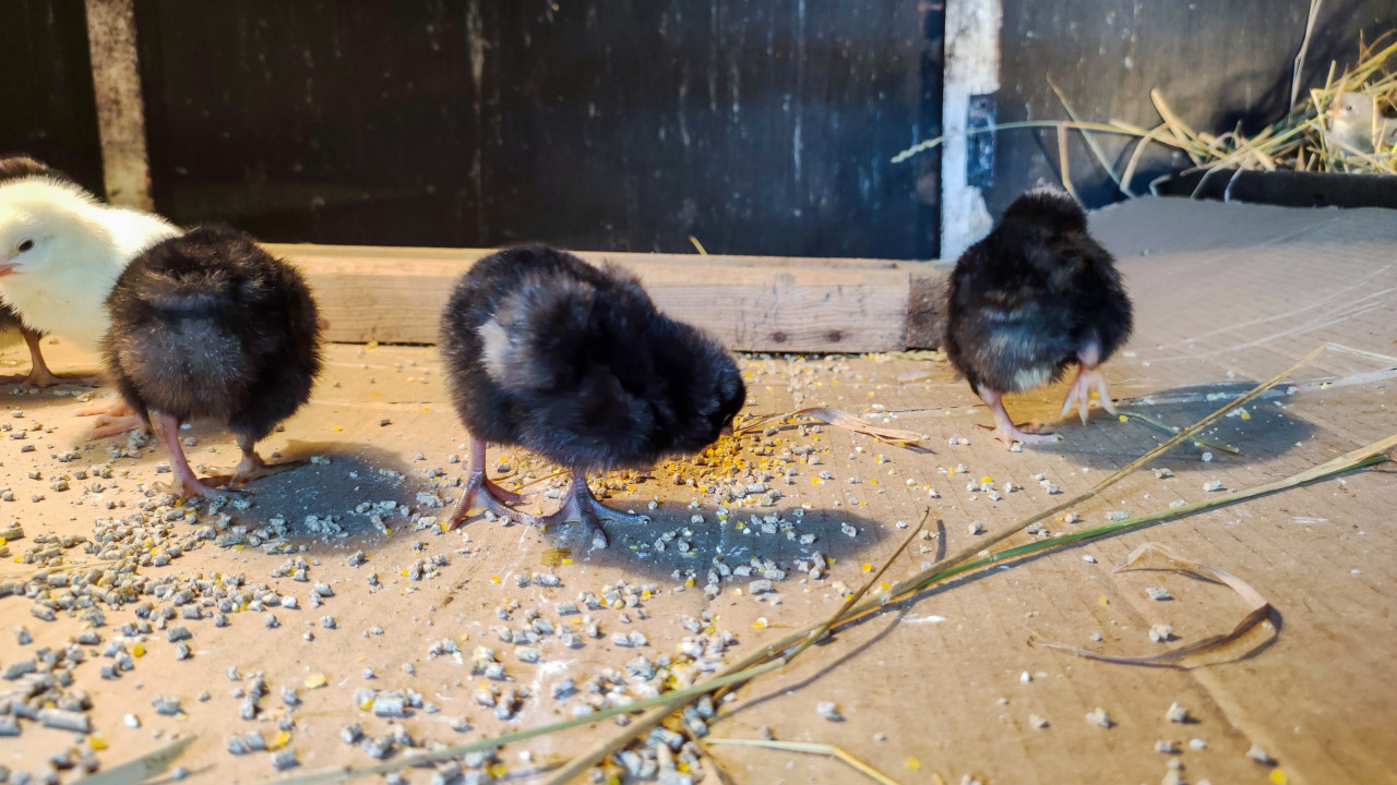животные птицы домашние животные домашняя птица птицеводство уход за птицей содержание птицы разведение птицы домашнее хозяйство цыплята птенцы молодняк чёрные цыплята кормление клюёт корм корм комбикорм гранулы корма рассыпанный корм крупинки деревянный пол настил солома сено стебли птичник курятник брудер ферма мини ферма сельское хозяйство деревенский бытПохожие фотографии