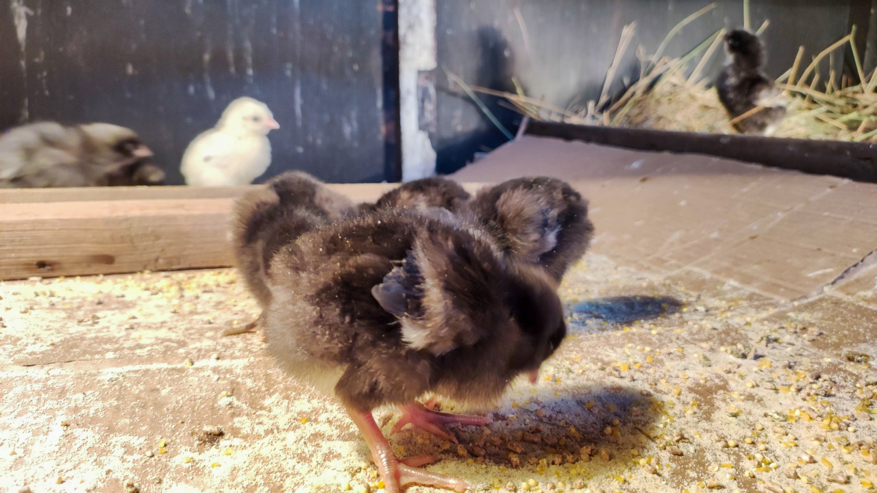 Чёрные цыплята на полу брудера возле подстилки из сена