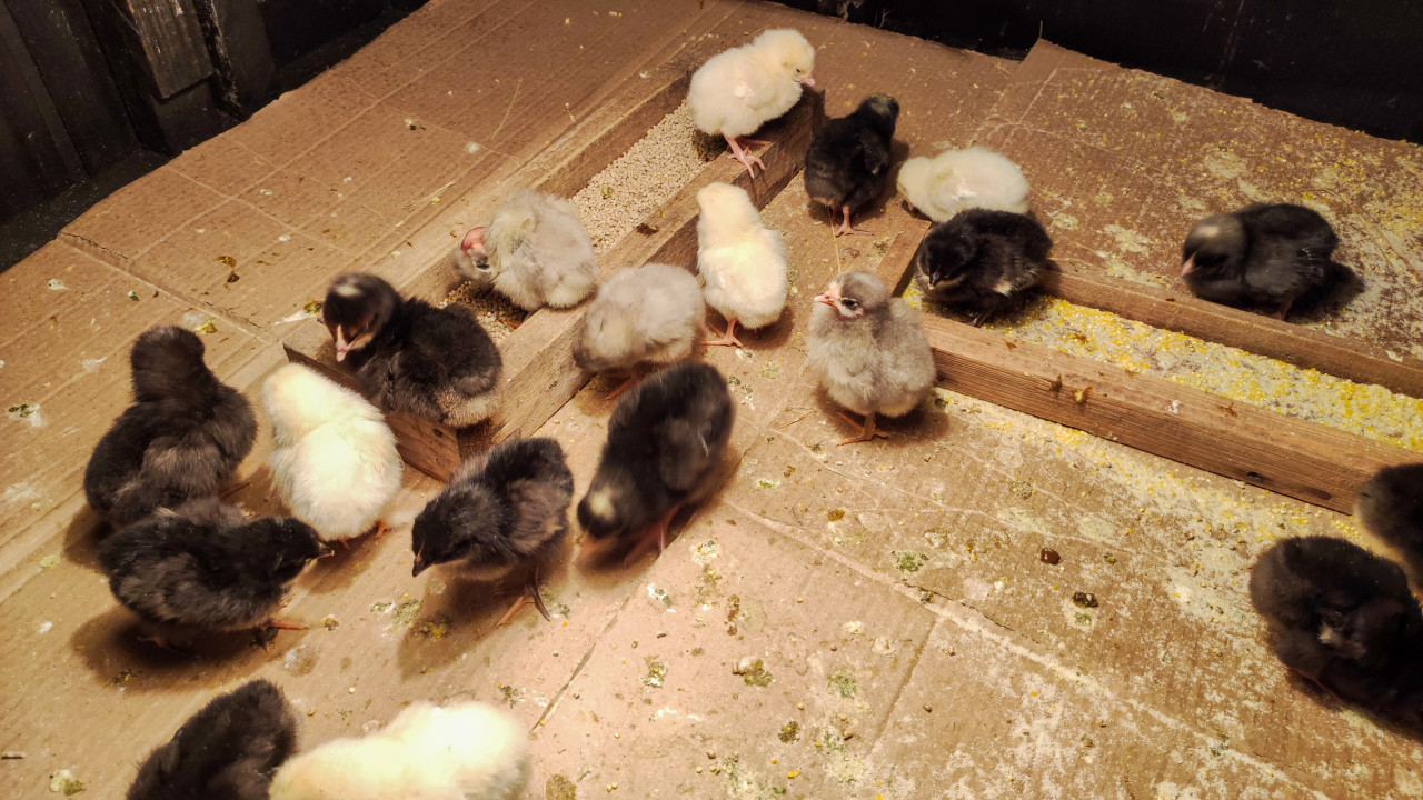 Вид сверху на группу цыплят в брудере: птенцы чёрного, белого и серого окраса распределились по полу и по деревянным планкам, часть стоит на возвышении, часть клюёт корм внизу. На поверхности заметны крошки комбикорма, следы подстилки и мелкие перья, по краям видны тёмные стенки помещения. Освещение тёплое, равномерное, как от лампы обогрева, поэтому пух выглядит мягким и объёмным. Фото подходит для тем о домашнем птицеводстве, содержании молодняка, фермерских хозяйствах и сельской жизни.