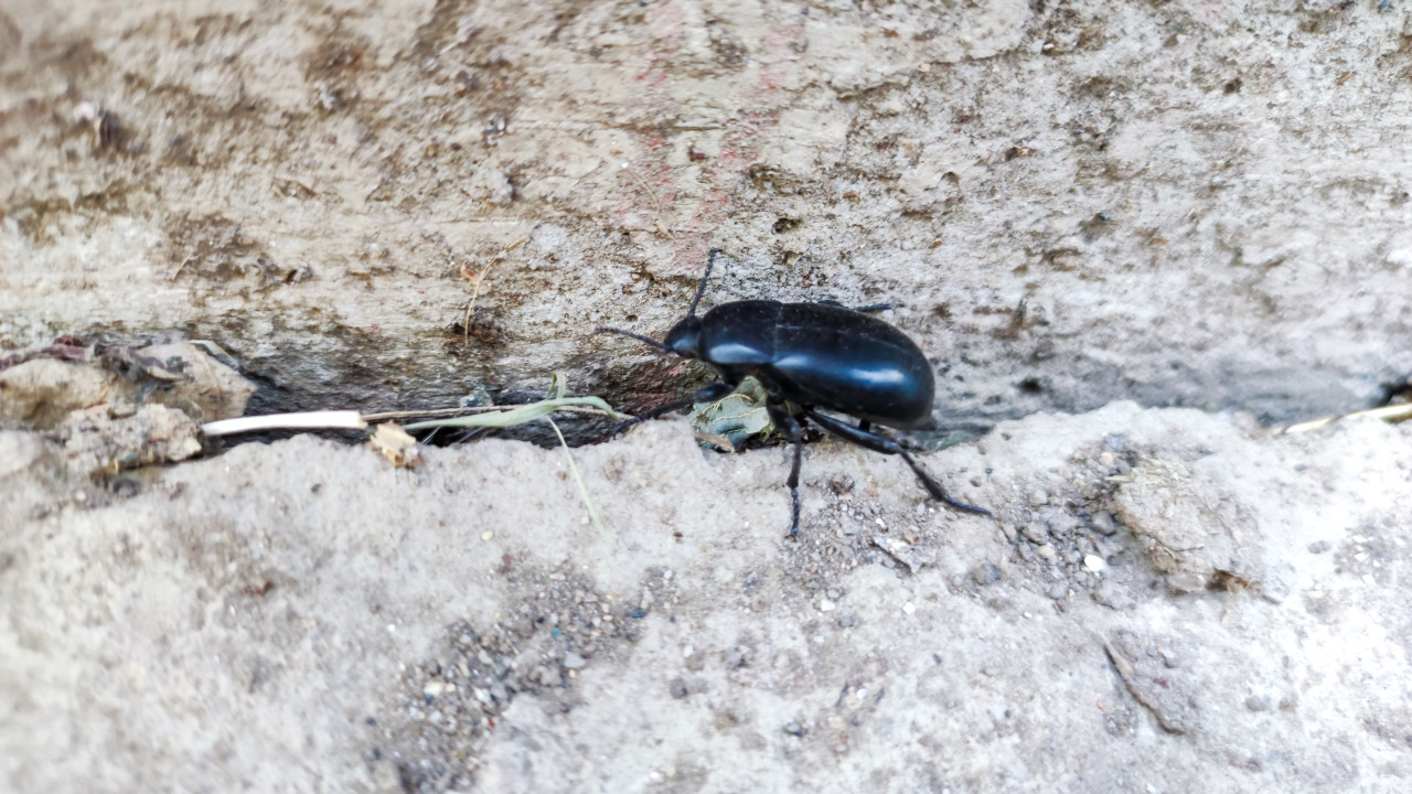 На снимке чёрный жук показан сбоку: он ползёт вдоль щели у светлой каменной/глиняной поверхности, опираясь на длинные ноги. Блестящие надкрылья отражают дневной свет, заметны усики и контуры головы. В нижней части кадра видна сухая почва с мелкими камешками и частицами песка, рядом лежат тонкие травинки и растительные остатки. Фон мягко размывается, подчёркивая насекомое и фактуру грунта. Съёмка выполнена на улице летом (июль) при естественном освещении. Фотография пригодна для статей об энтомологии, биоразнообразии, экологии и природных текстурах.
