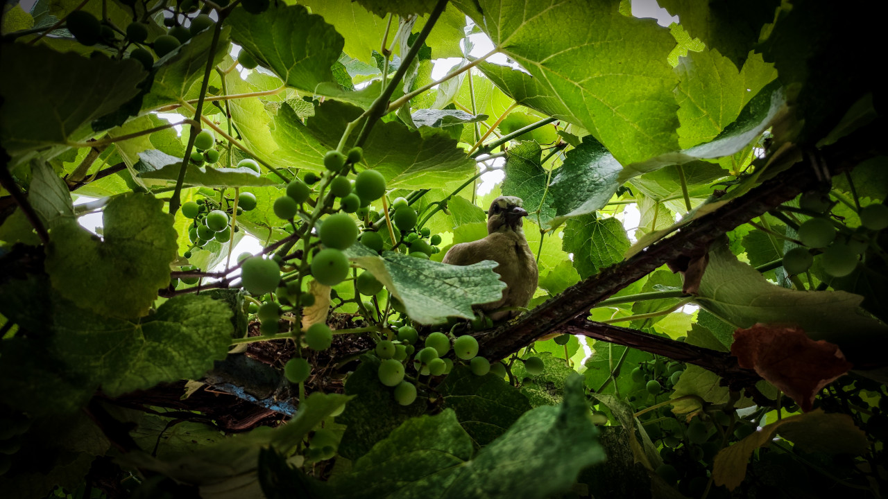 Птица среди листьев винограда и зелёных гроздьев