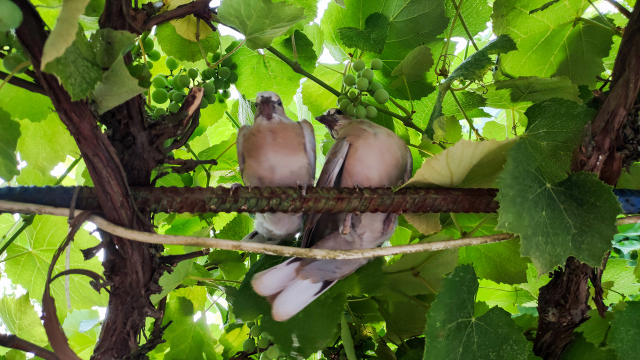 Июль 2024. Под плотным пологом виноградных листьев на одной ветке сидят два птенца голубя, прижавшись друг к другу; рядом свисают гроздья зелёного незрелого винограда. В кадре заметны переплетение лозы, крупные листья с выраженными прожилками и мягкий рассеянный свет, создающий глубокие зелёные тени. Сюжет передаёт поведение молодых птиц в саду и использование лозы как безопасного укрытия. Фото уместно для тем про птенцов и выводок птиц, природу на даче, биоразнообразие сада, виноградники и экологические материалы.