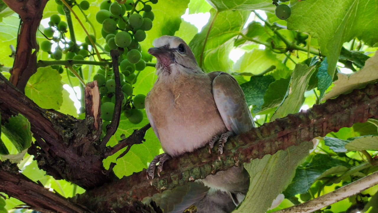 Июль 2024. Птенец голубя сидит на ветке виноградной лозы, вокруг плотные зелёные листья и свисающие гроздья незрелого винограда. Крупный план позволяет рассмотреть молодое оперение, форму клюва и лапы на коре, а также фактуру листьев и побегов. Свет мягкий, фильтруется через листву, создавая контраст между яркими участками и тенями. Фото подойдёт для публикаций о птенцах и взрослении птиц, природе в саду, экологических сюжетах о городской и дачной фауне, а также для учебных материалов по орнитологии.