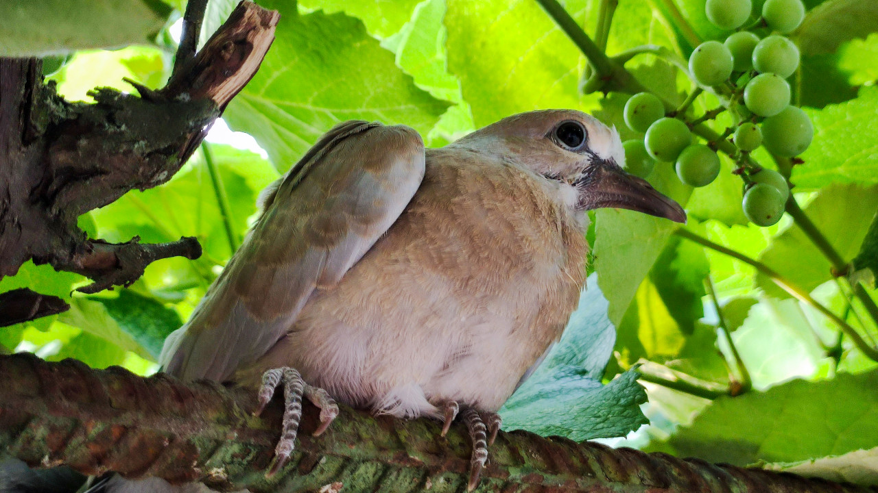 Июль 2024. Птенец голубя сидит на горизонтальной ветке виноградной лозы, рядом крупно видна гроздь зелёного незрелого винограда. Листья образуют яркий зелёный фон с прожилками и пятнами света, а переплетённые побеги создают ощущение плотной растительности. Кадр подчёркивает близость молодой птицы к плодам и использование лозы как места отдыха и укрытия в садовой среде. Фото можно использовать для тем о дикой фауне на участке, жизни птиц рядом с человеком, виноградарстве и иллюстраций к образовательным материалам по экологии и орнитологии.