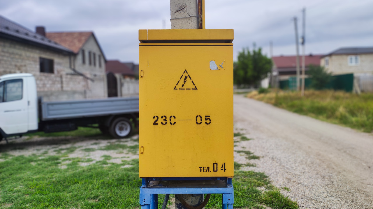 Электрощит с открытой дверцей на опоре в загородном посёлке