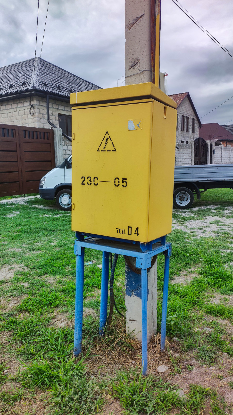 инфраструктура инженерные сети энергетика электроснабжение коммунальное хозяйство безопасность предупреждение знак маркировка электричество электрика электрический шкаф электрощит уличное оборудование технический объект предупреждающий знак распределительный шкаф бетонная опора воздушная линия провода жёлтый цвет металл частный сектор жилой район сельская местность частные дома забор грузовик трава грунт пасмурное небоПохожие фотографии