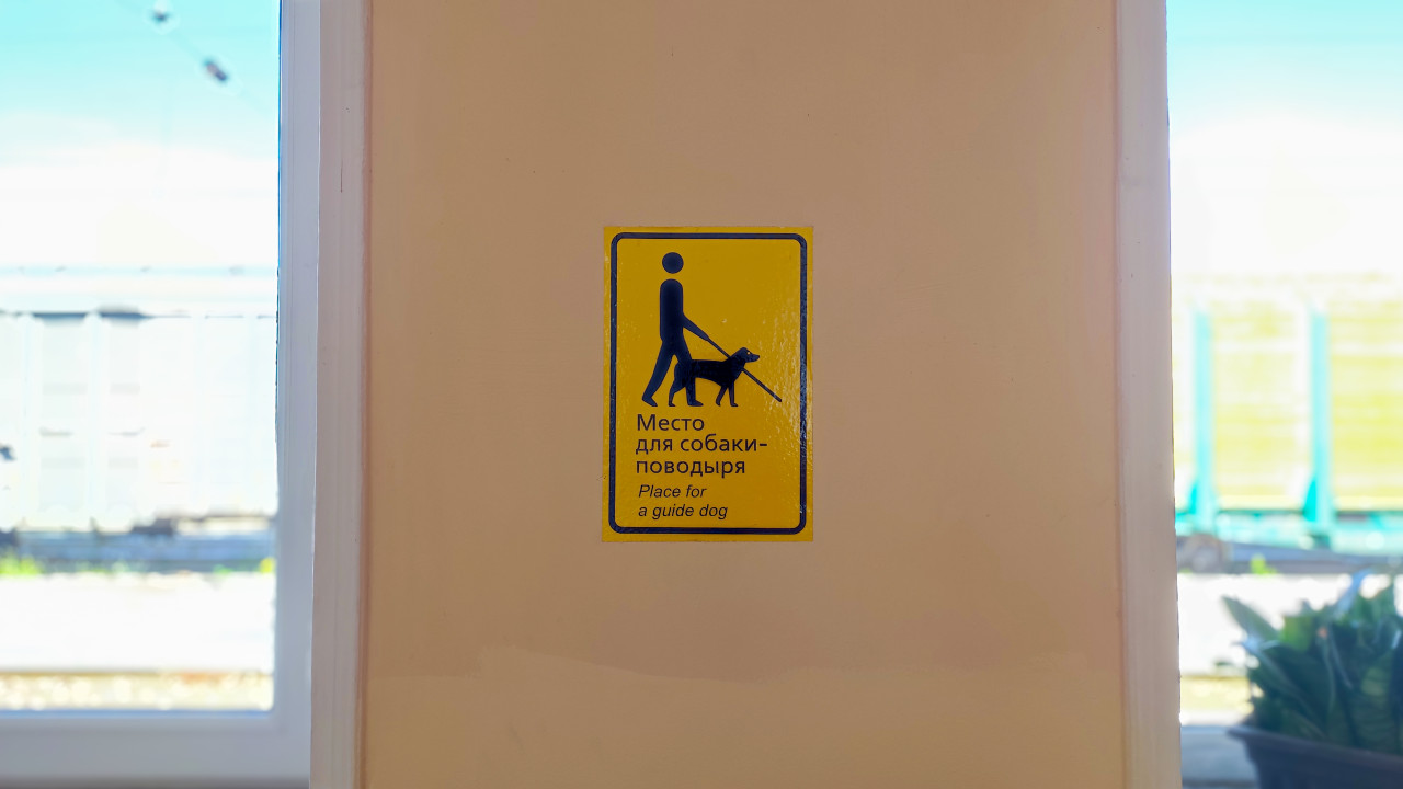 доступная среда безбарьерная среда инклюзия доступность социальная инфраструктура общественный транспорт железная дорога вокзал инфраструктура сервис навигация информационный знак пиктограмма помощь пассажирам безопасность собака поводырь guide dog люди с инвалидностью слабовидящие социальная поддержка зал ожидания правила указатель жёлтая табличка окно дневной свет городской транспорт комфортПохожие фотографии