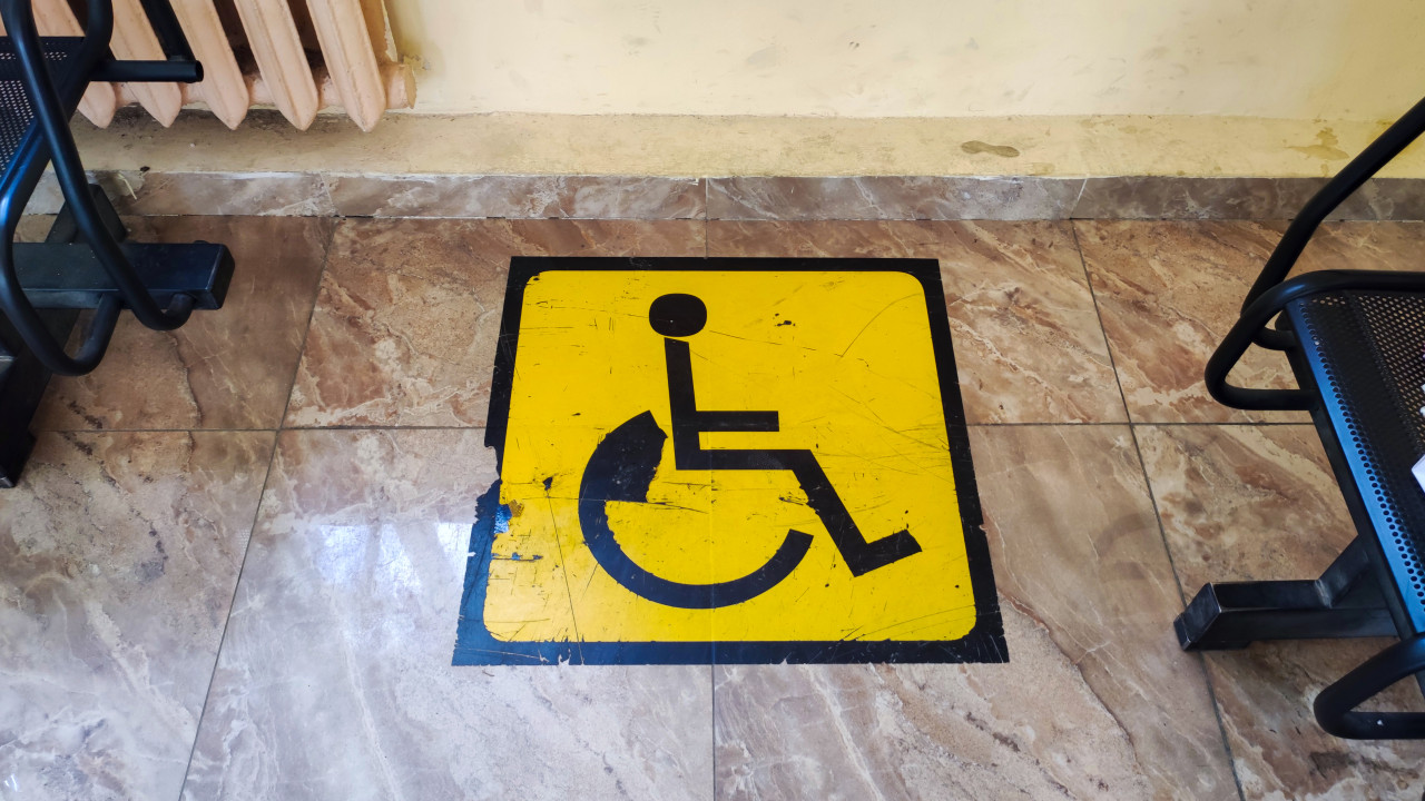 На плиточном полу в помещении размещён квадратный жёлтый знак с пиктограммой инвалидной коляски, обозначающий доступную зону или место для маломобильных пассажиров. Разметка заметно потёрта и поцарапана, по краям видны следы износа. В кадр попадают металлические ножки сидений, радиатор отопления и нижняя часть стены с грязевыми отметинами, что создаёт документальный характер снимка. Освещение дневное и равномерное. Фотография подходит для иллюстраций о доступной среде, инфраструктуре вокзалов и организации пространства для людей с инвалидностью.